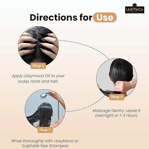 Step 1: Apply Lissymoco Oil to your scalp, roots and hair strands.